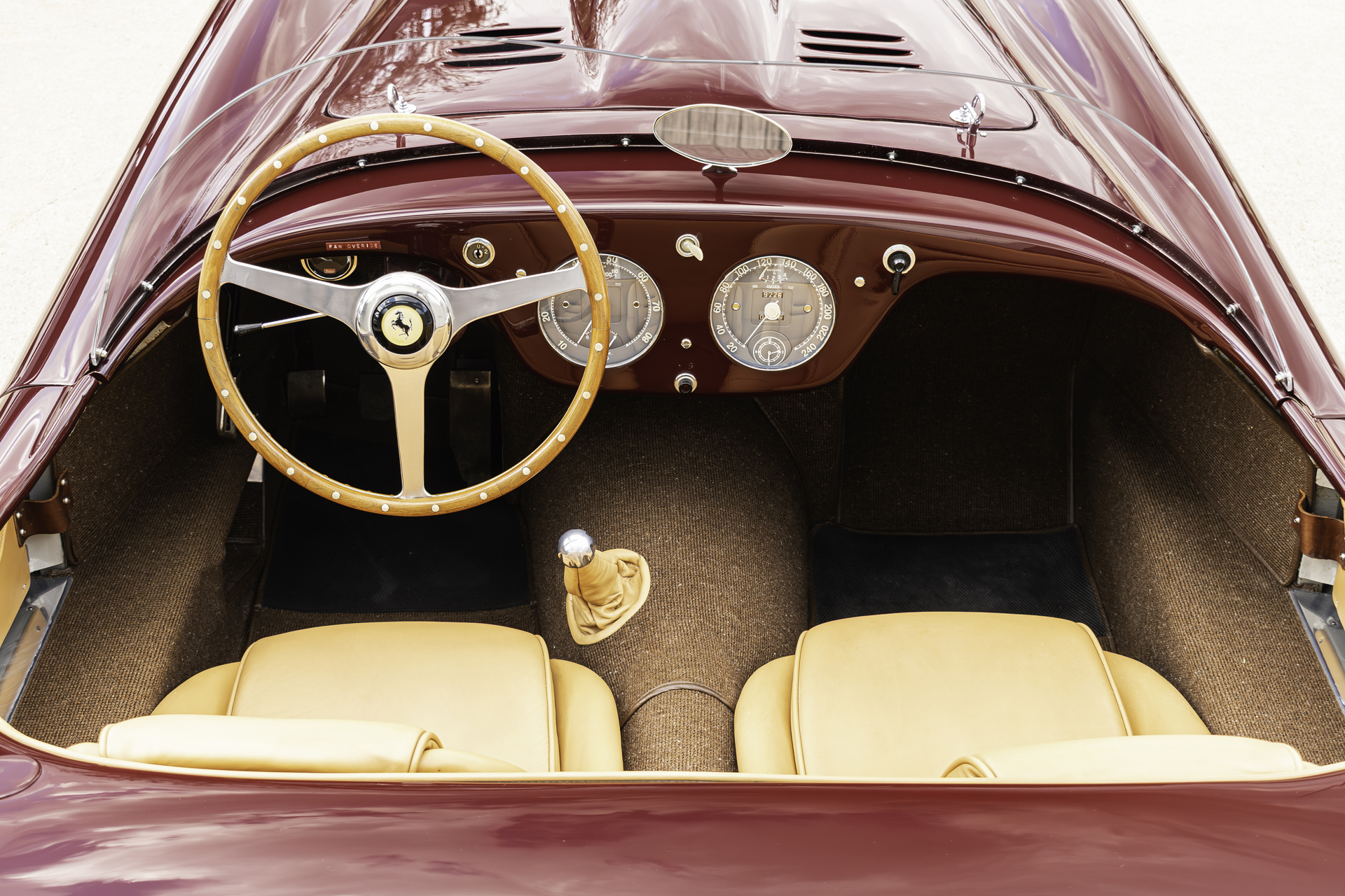 Front to back, its hand-shaped aircraft-grade aluminum coachwork is finished in Glasurit Dark Red (SR353.50) and Silver (MB 180). A newly fabricated grille houses discreet driving lamps—an evocative period-style modification—while details from the Monza-style fuel cap and riveted fuel tank surround to reproduction taillights, and proper bonnet/trunk closures reinforce the car’s bespoke character. Inside, Tan Connolly leather upholstery is complemented by Brown carpets, a wood-rimmed steering wheel, and 166–250 Series-style instruments, switchgear, and indicator lights. Seat construction and interior trim were completed by Lake County Upholstery, presenting a cockpit appropriate to the era.