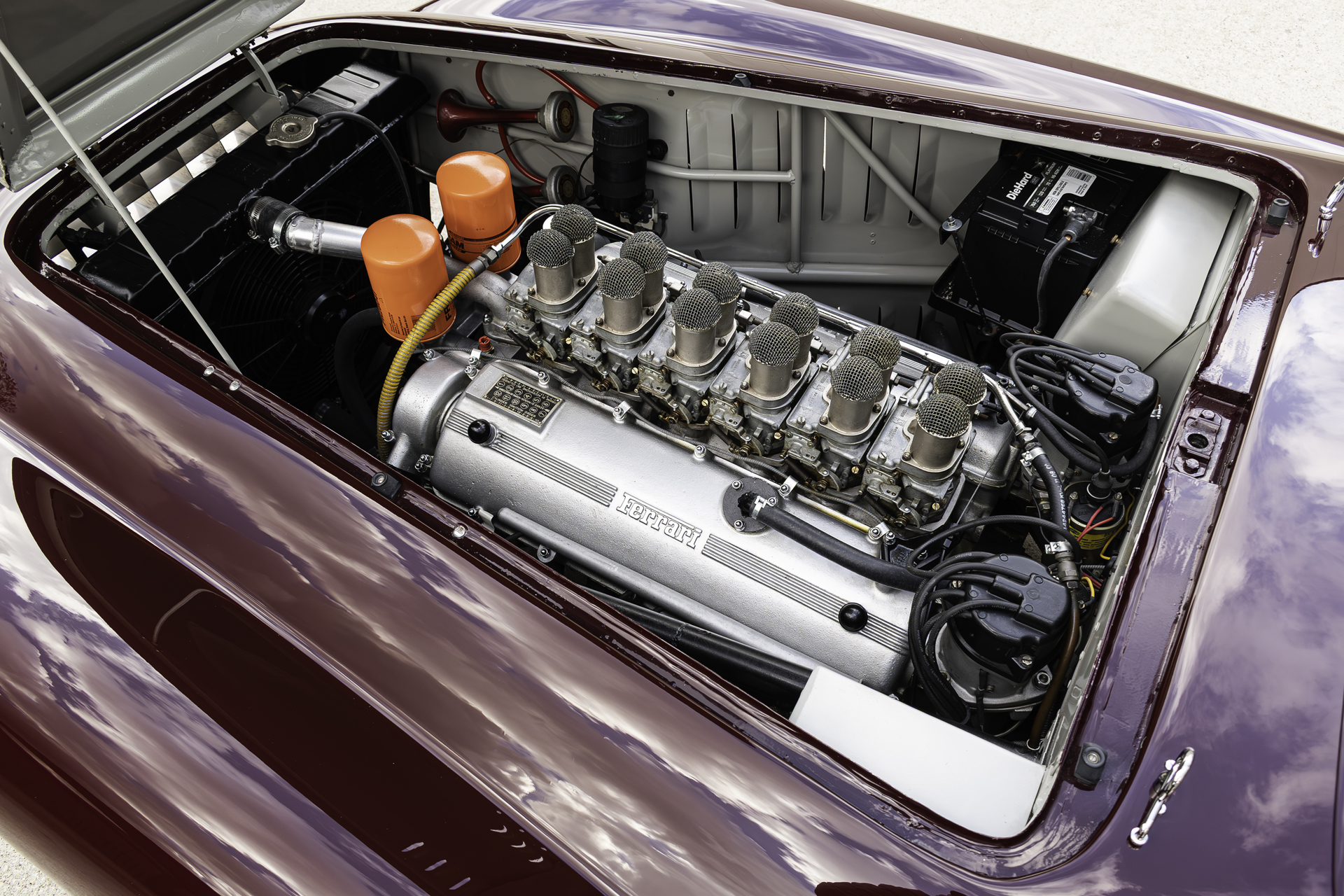 Power comes from a 4.0-liter Type 209 Colombo V12, factory rated at 300 horsepower and rebuilt under previous ownership. The original crankshaft has been polished, new cylinder liners installed, and standard pistons and rod bearings fitted; compression tests show a healthy and consistent 150 psi across all twelve cylinders. Enhancements include needle-bearing rocker followers, updated camshafts, six Weber 40 DCN carburetors with velocity stacks, revised oil cooler routing, and MSD electronic ignition. Daytona racing headers by Joe Alphabet, Jet-Hot coated for durability, provide both free-breathing performance and a stirring exhaust note.
