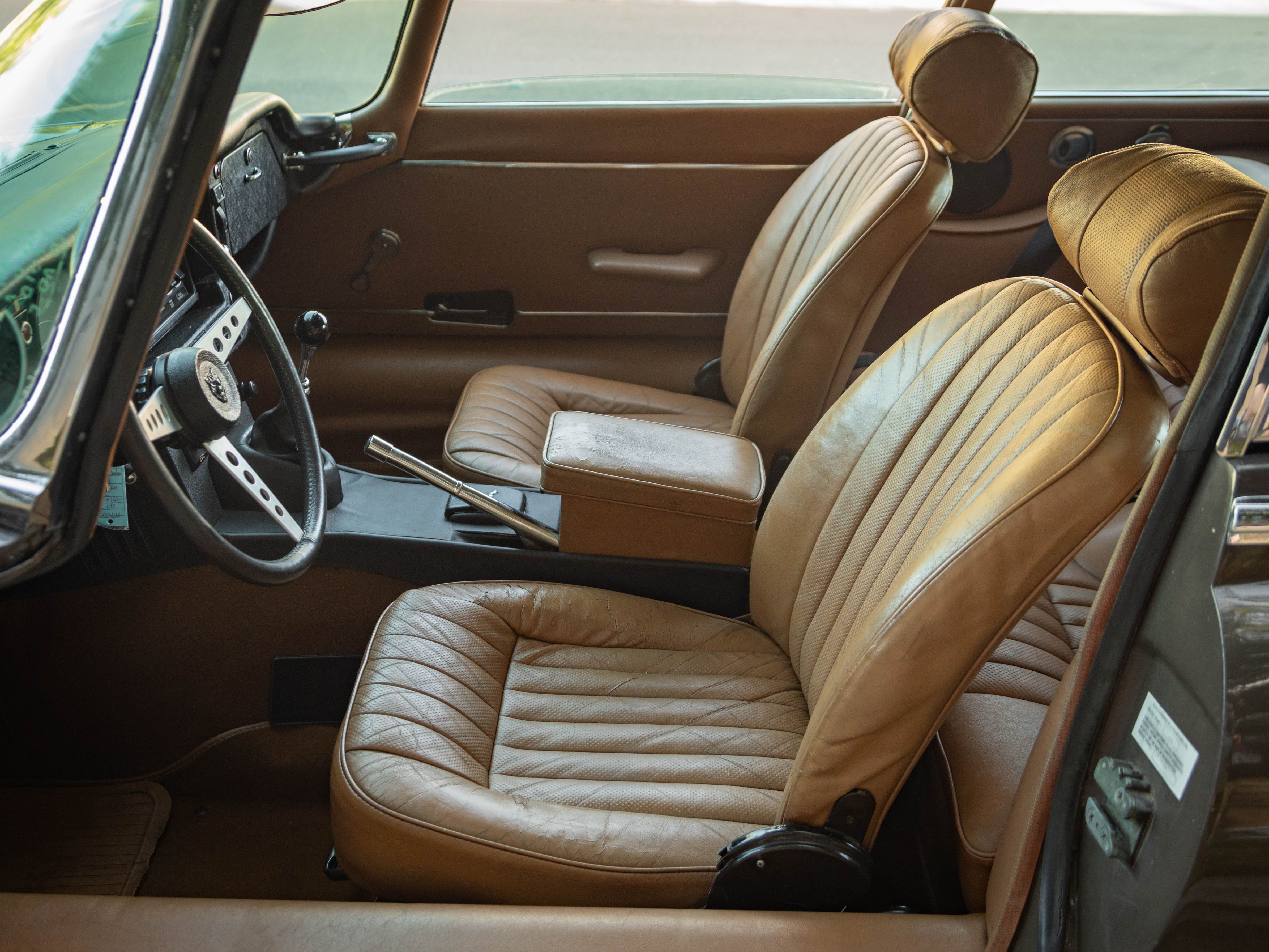 Beneath the flowing front bonnet, power is provided by Jaguar’s smooth 5.3L V12 paired with a desirable 4-speed manual transmission. The body is reported to be straight, retaining its original paint with only minor age-consistent imperfections visible upon close inspection—an increasingly uncommon attribute among surviving E-Types. Quad-tipped exhaust, and factory wire wheels with white-stripe tires plus a full-size spare and jack further enhance the car’s complete collector appeal.