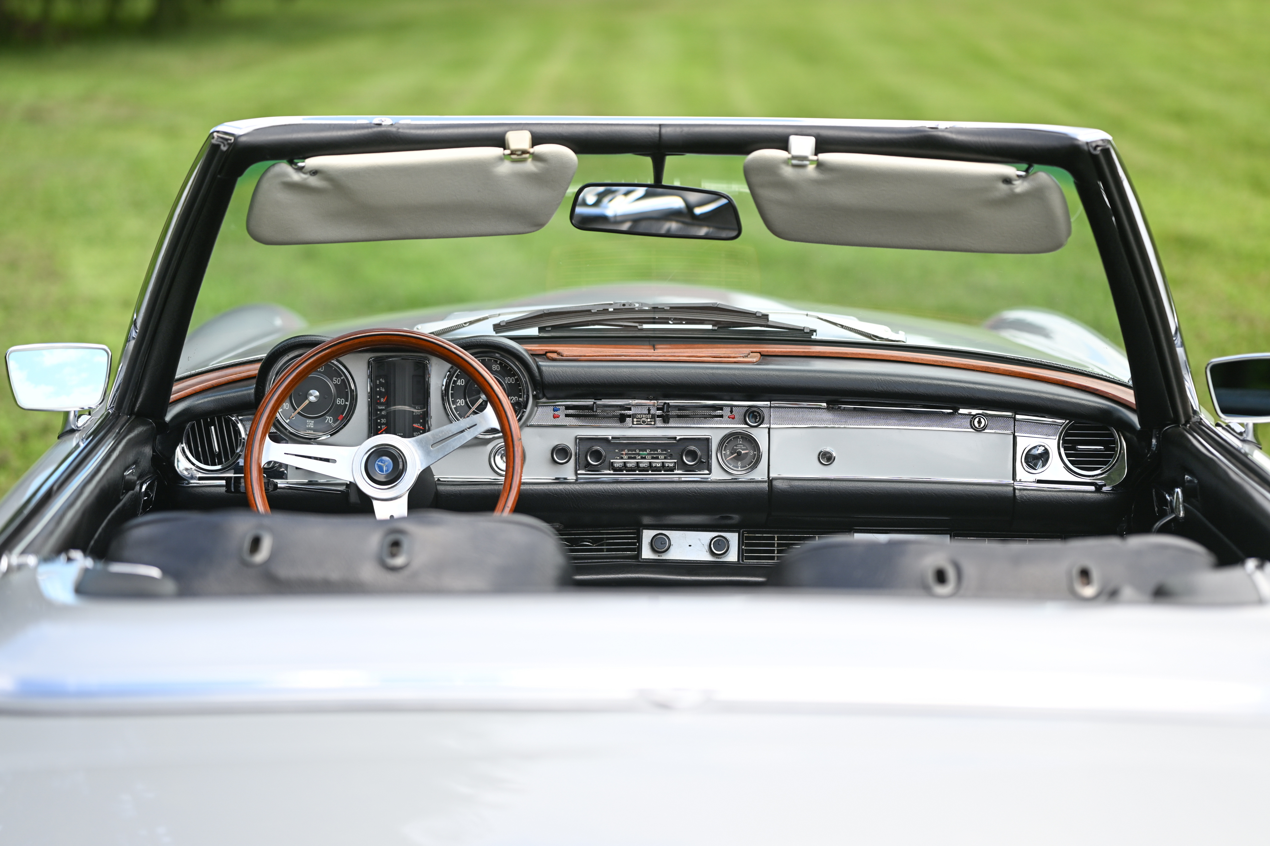 The W113-generation Mercedes-Benz 280SL has become a cornerstone of automotive design. A nearly level line can be drawn from the front headlights to the trunk, and its airy removable greenhouse remains instantly recognizable to the present day. The hardtop’s aesthetics—credited to Mercedes safety engineer Béla Barényi, resembles a pagoda architectural form, adding structural reinforcement with artful style. An inline six-cylinder engine provided stout motivation matched by luxury touches like a Becker Europa radio and heat-insulated glass to set the model apart as a versatile tourer in its day.