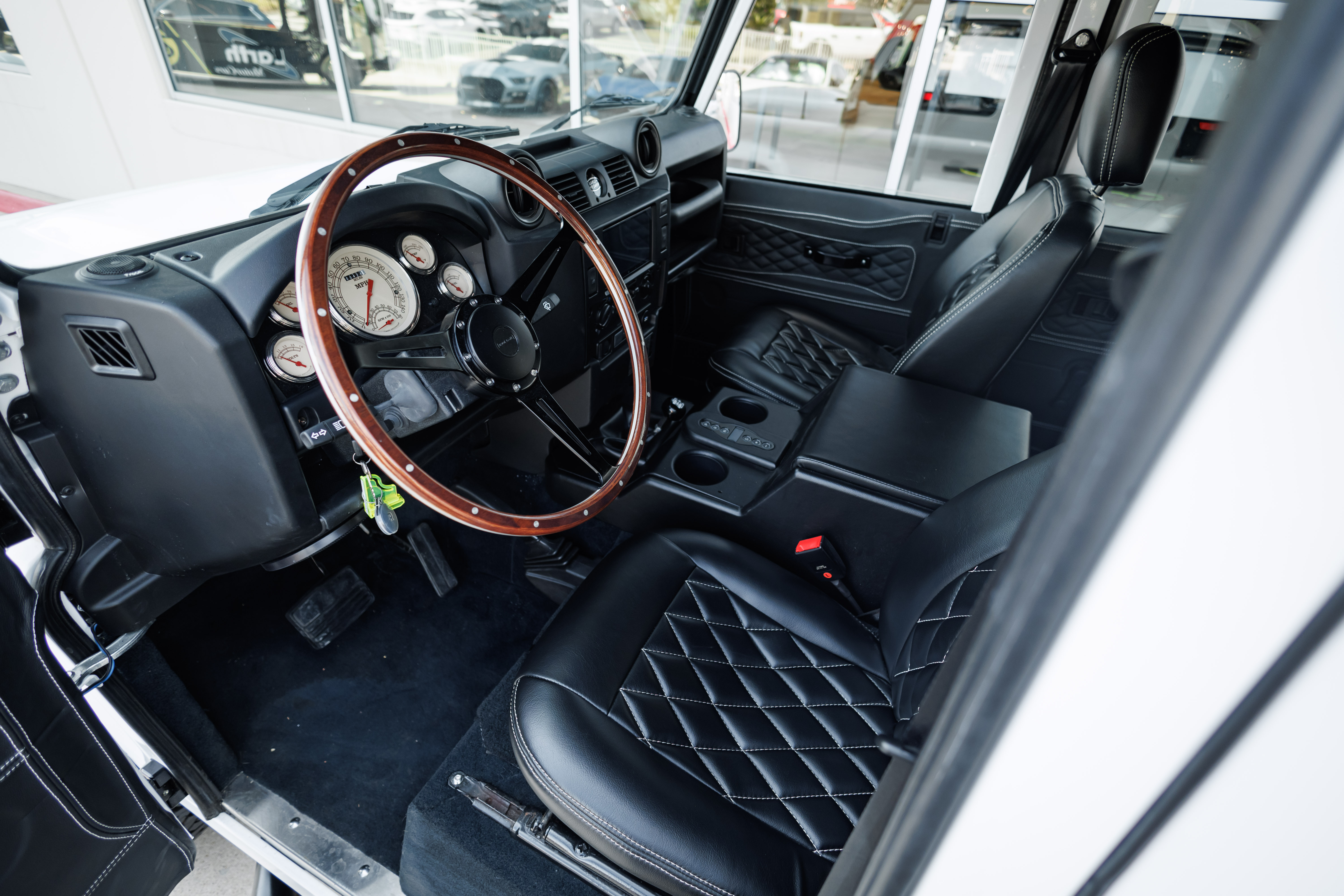 Power now comes from a 6.2L LS-series V8 engine, paired with a 6L80E automatic transmission - now operated by a push-button gear selection setup housed in the center console. A variety of upgraded components ensure optimal, turn-key performance from this Defender in any settings - including a transmission cooler, Allisport radiator with electrically-operated fans, rebuilt transfer case and center differential, along with rebuilt axles and a rear-mounted fuel tank. These are rounded off by a custom exhaust system that emphasizes the American-engineered V8 under the hood of this British 4x4.