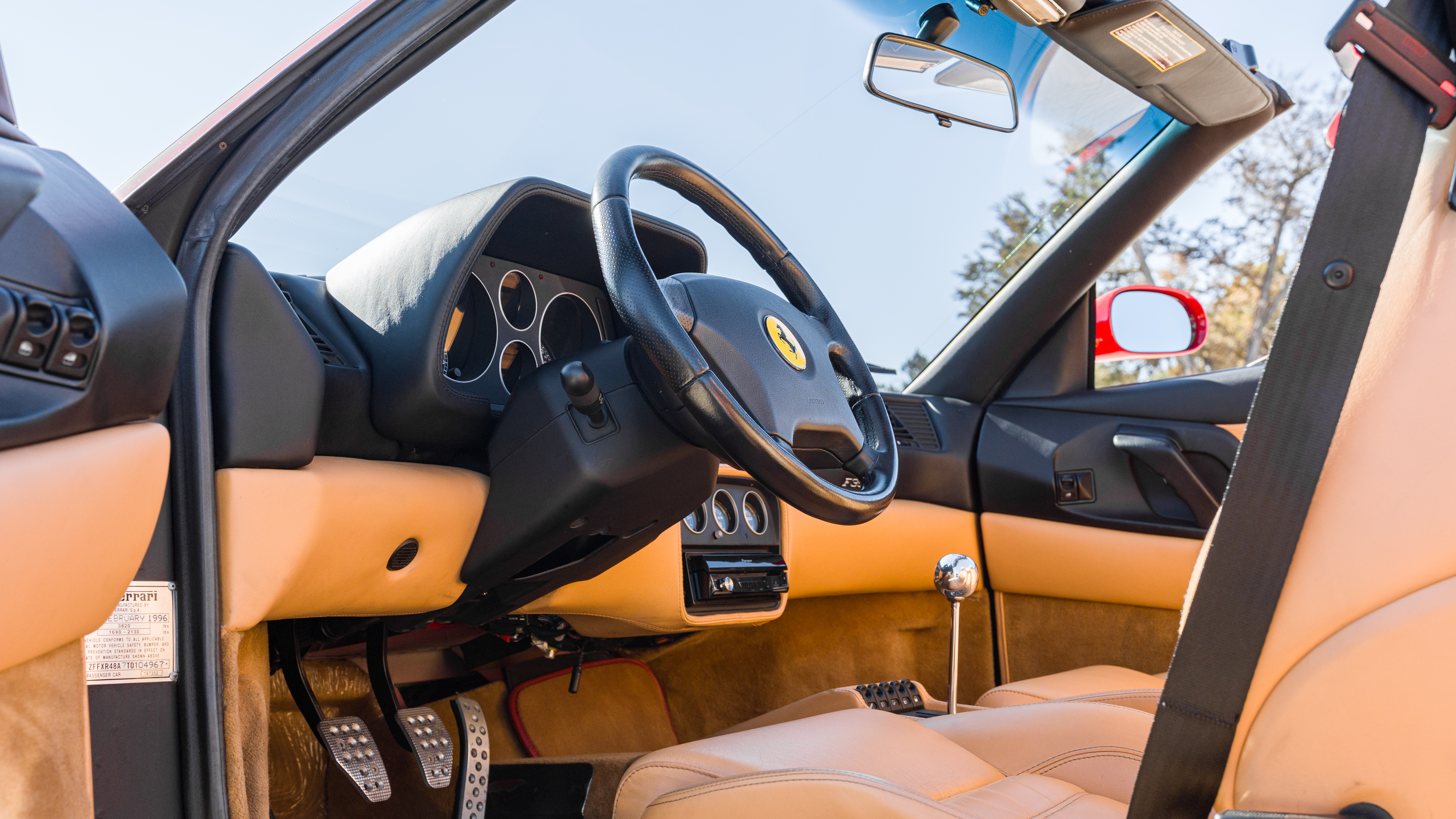 This 1996 Ferrari 355 Spider marries mid-engine convertible styling, iconic Rosso Corsa paint, and gated six-speed manual shifting for truly analog Italian motoring. Its instantly recognizable contours are highlighted with period correct equipment including a power folding soft top convertible roof, retractable front headlights, Scuderia Ferrari shields, and alloy wheels wrapped in Michelin Pilot Super Sport tires. Reported exterior modifications include a Ferrari Challenge grille, tinted windshield and side windows, along with previous application of paint protection film on select front sections for long-term preservation.