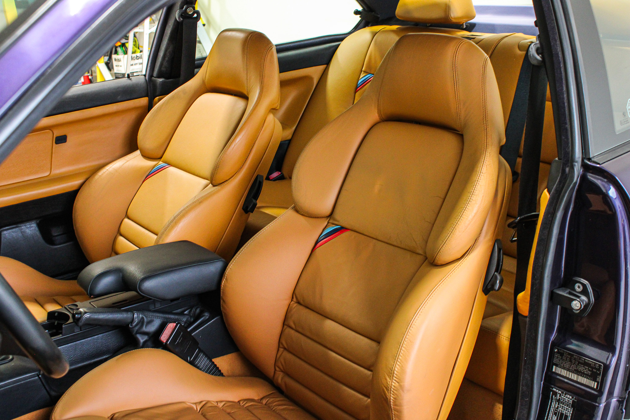 The interior is equally compelling, featuring power-adjustable Vader sport seats with M-sport accents complemented by tan carpets and floor mats. A leather-wrapped steering wheel and M-badged shift knob complete tactile driver touchpoints. Comfort and convenience amenities include dual-zone automatic climate control, cruise control, an onboard computer, traction control, and Harman Kardon AM/FM/cassette audio, underscoring the M3’s dual role as both a performance icon and a refined grand tourer.