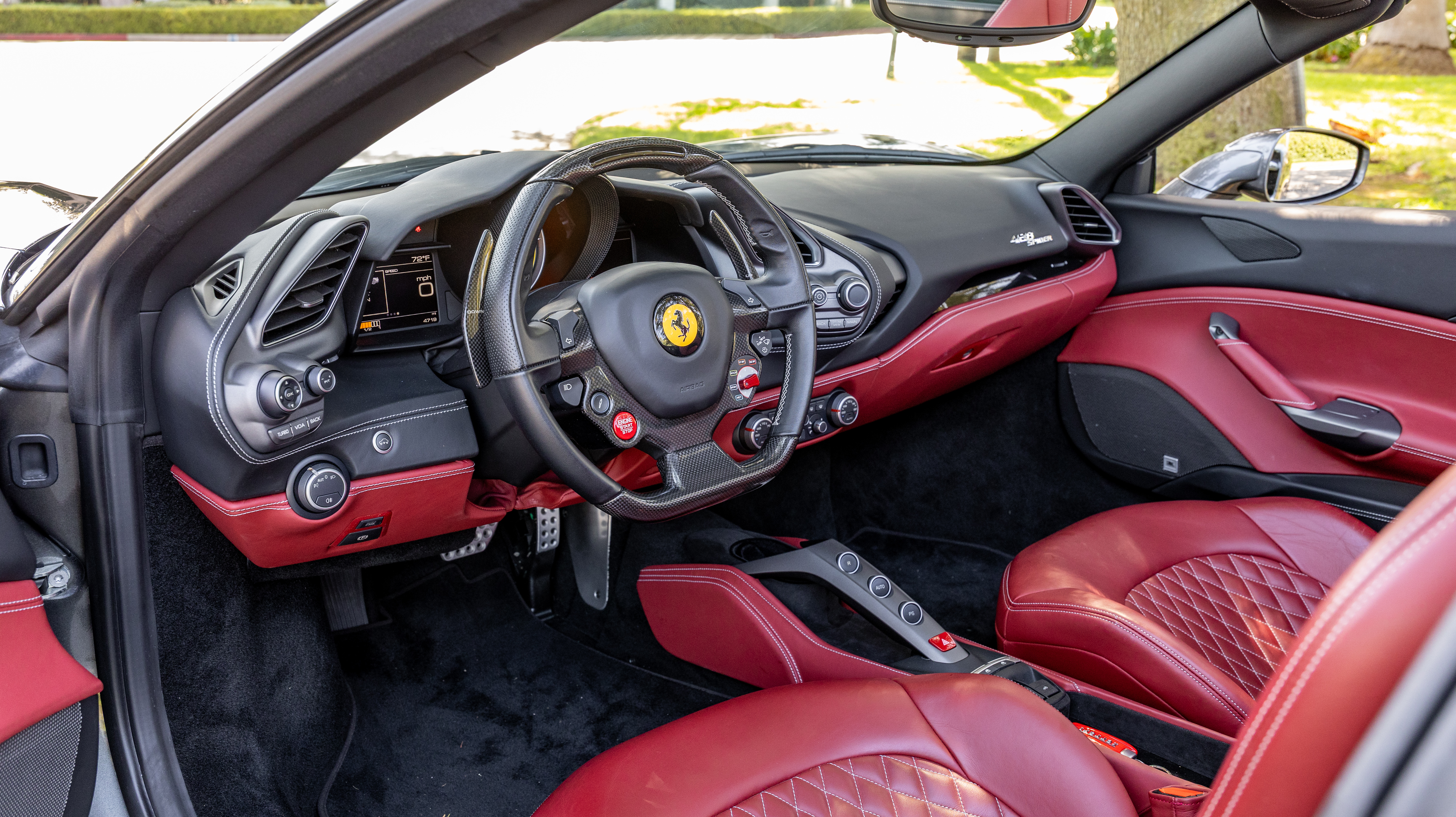 This example shows just 4,700 miles from new and features an impressive suite of factory options detailed on its personalization plaque. Highlights include the Carbon Fiber Driver Zone with LEDs, Rosso Scuderia brake calipers, 20-inch forged diamond wheels, Suspension Lifter, and Sport Exhaust System. The cabin is equally refined, showcasing Electric Seats with Diamond Stitching, Cavallino headrest embroidery, and Grigio special stitching (0318) that complements the dark exterior tones. A Premium Hi-Fi System, front and rear parking sensors, and Homelink-equipped mirrors complete the interior’s modern convenience.