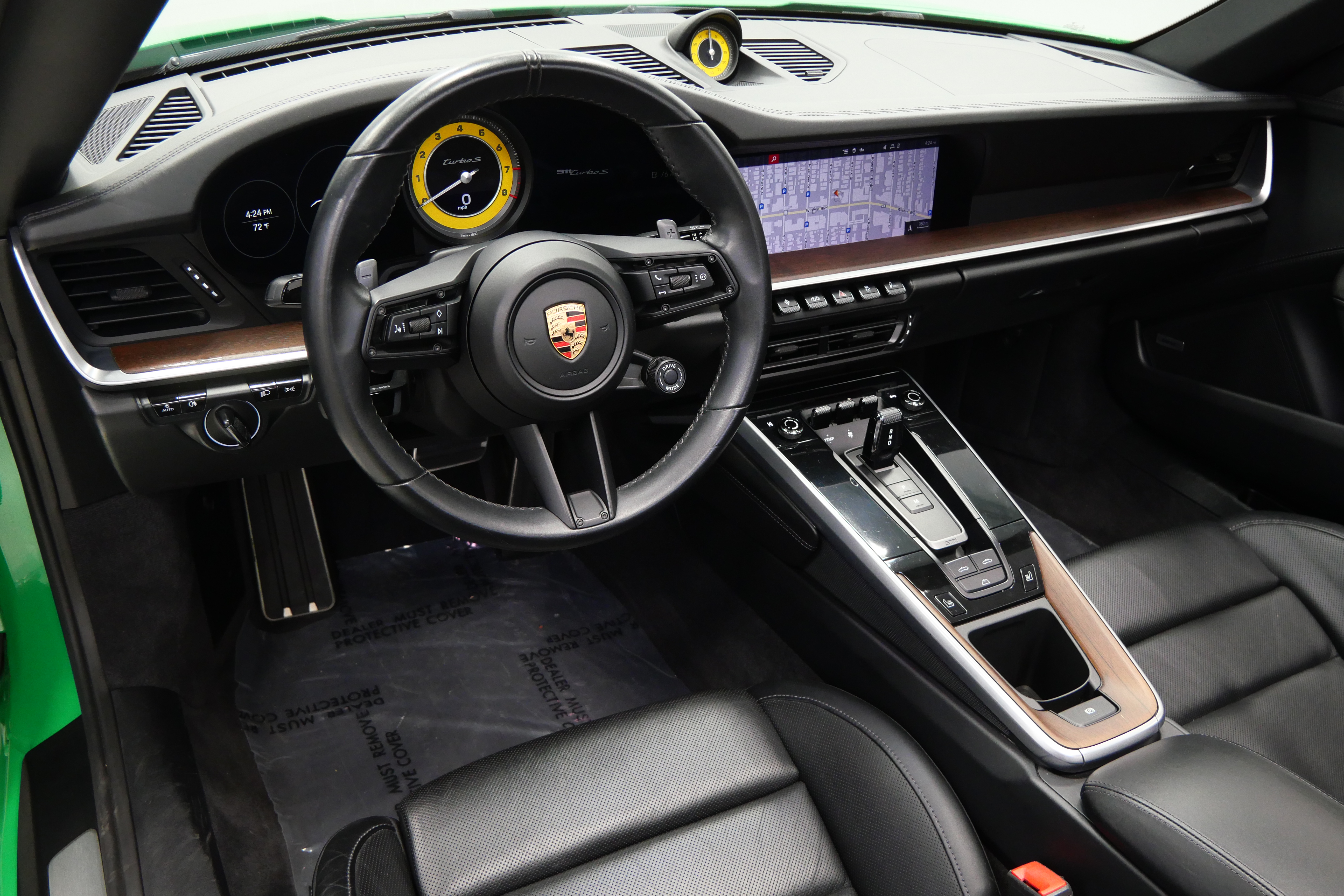 Ordered in one of Porsche’s most vivid modern colors, the car’s Python Green paint is complemented by Black exterior accents and a power-operated soft top. Factory options include PASM Sport Suspension (lowered 10 mm), a Sport Exhaust System with Black tailpipes, and LED Matrix Design headlights in lack with PDLS+. Additional bespoke touches include Racing Yellow instrument trim, with the central tachometer and Sport Chrono dials finished in the same hue, along with matching Racing Yellow seat belts—a subtle motorsport-inspired contrast.
