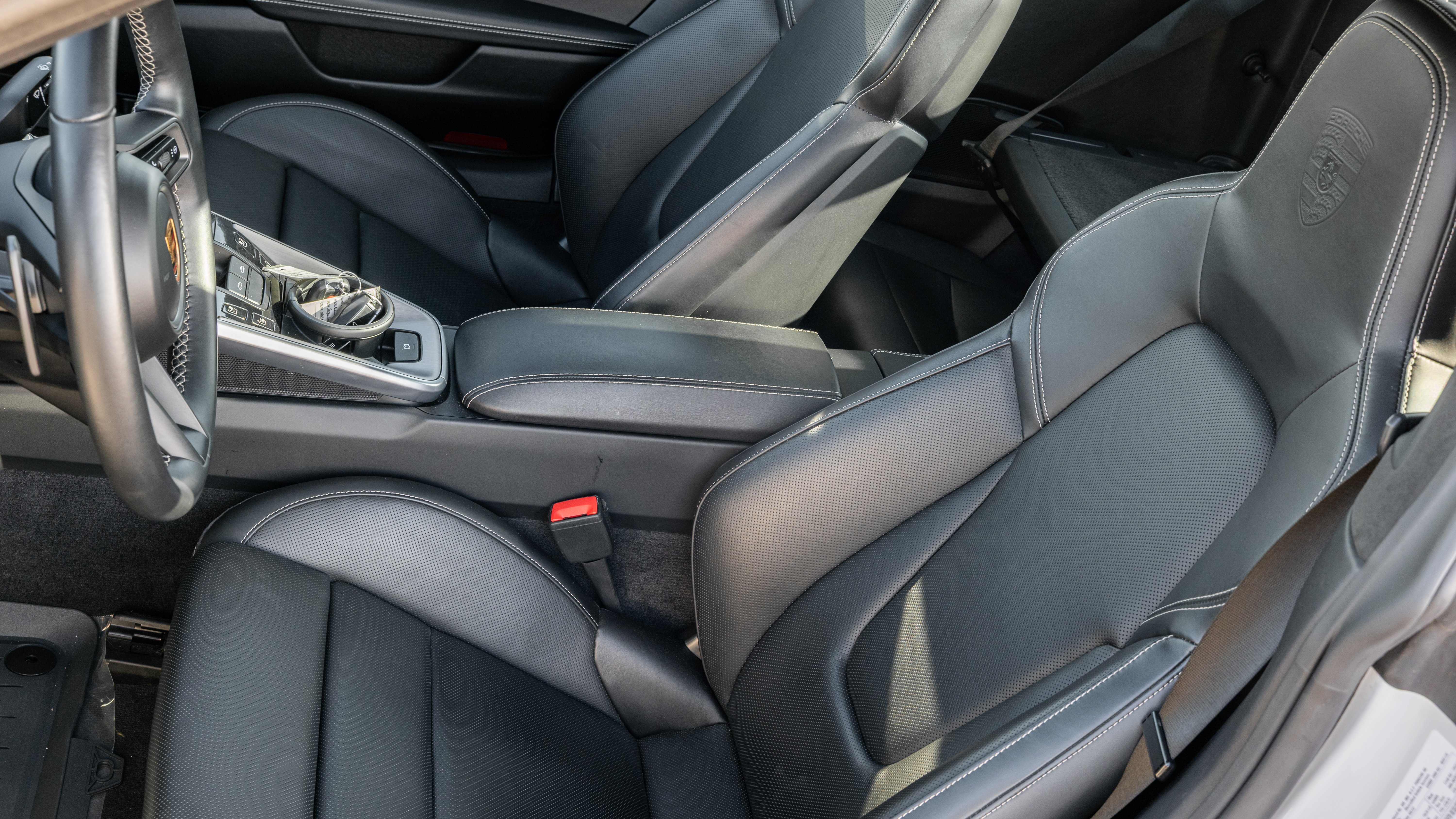 This example was specified with an original MSRP approaching $196,000, reflecting a highly optioned configuration. Highlights include the Sport Package and Premium Package, 18-way Adaptive Sport Seats Plus with memory, brushed aluminum interior trim, aluminum pedals and footrest, and illuminated brushed aluminum door sill guards. The cabin is further elevated by the Deviated Stitching Interior Package, extending contrast stitching across the dashboard, door panels, center console lid, and knee pads, along with Porsche crests embossed on the headrests—details that underscore the bespoke nature of this build