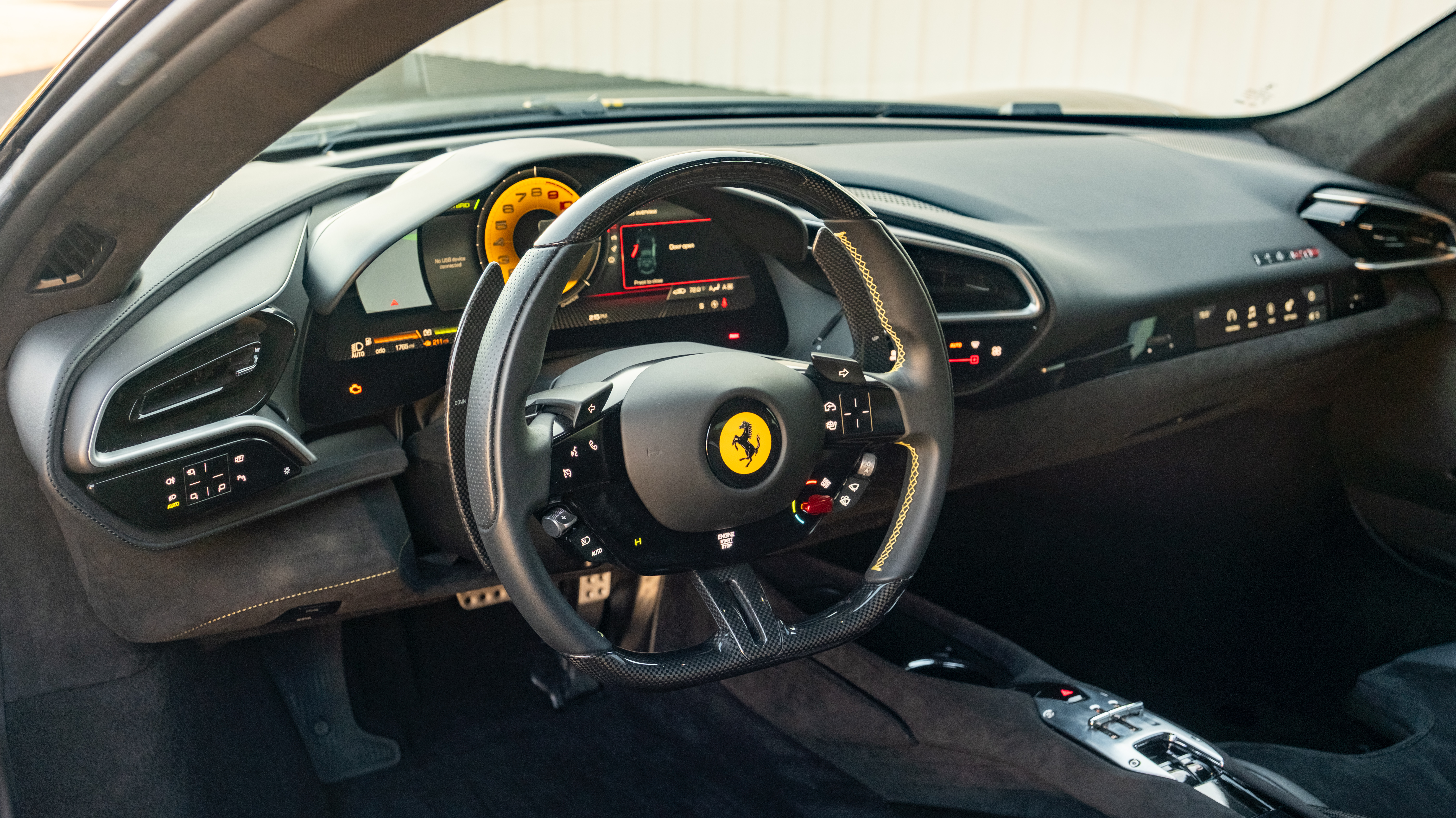 Inside, both occupants are surrounded by Nero upholstery, overlaid with Alcantara elements throughout. Yellow contrast stitching, headrest embroidery, and seatbelts coordinate on theme. Extensive carbon fiber is seen from racing seats and door panels to the e-Manettino steering wheel, shift paddles, and more. Further onboard amenities include MyFerrari Connect services, wireless device charging, an advanced front driving camera, electrochromic rearview mirror, and Apple CarPlay. Clean CarFax history highlights single ownership in California, and just 1,765 miles are indicated by the odometer. A transferable manufacturer warranty with Ferrari Genuine Maintenance accompanies the sale. This vehicle’s title is in transit and will arrive approximately three weeks after conclusion of the auction.