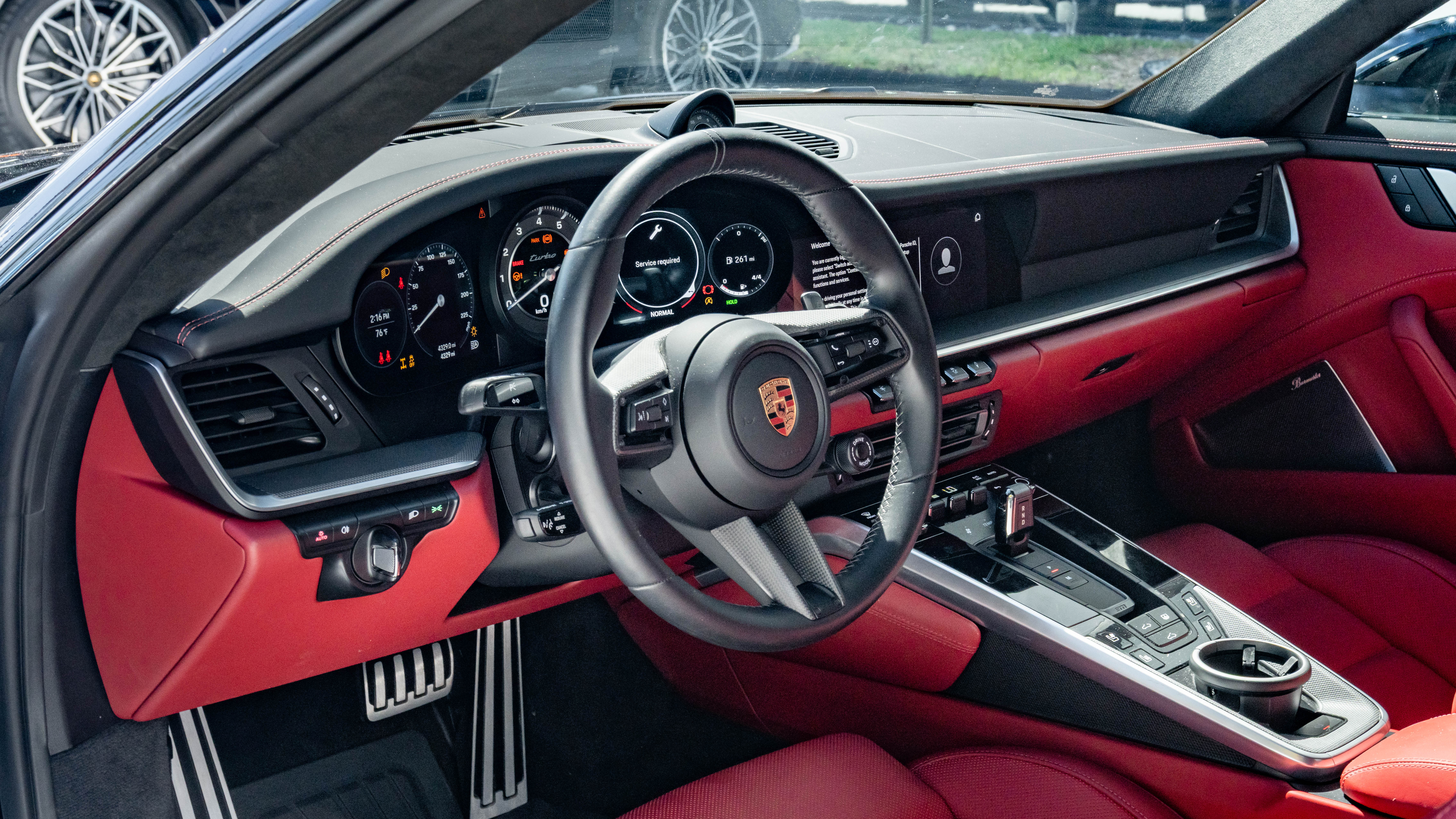 The Bordeaux Red and Black interior is equipped for both luxury and performance, with ventilated front seats, carbon-fiber matte heated GT Sport steering wheel, ambient lighting, aluminum pedals, and the Porsche crest embossed on the headrests. Additional convenience features include Remote ParkAssist with Surround View, Lane Change Assist, and under-door puddle light projectors. Presented in excellent condition with low mileage and an enviable specification, this 2023 911 Turbo offers the perfect blend of power, craftsmanship, and everyday usability—a quintessential modern Porsche.