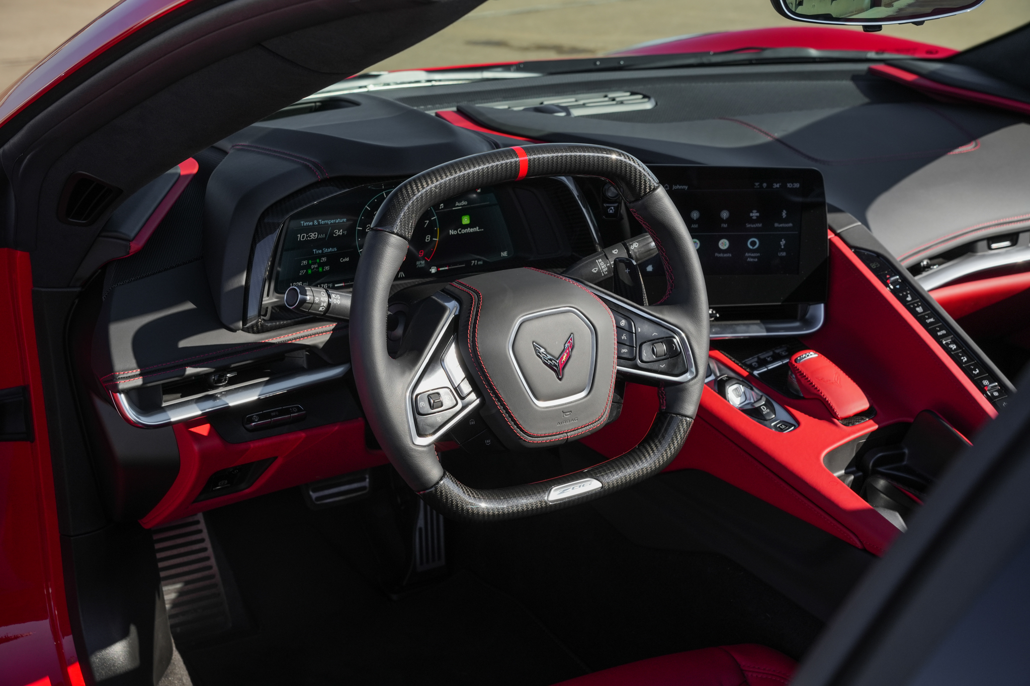 The interior is finished in Adrenlaine Red leather upholstery matched by Torch Red seatbelts and carbon details throughout, from the instrument cluster surround and center console to side sill plates, steering wheel trim, and paddle shifters. Microfiber suede adds to luxurious touchpoints all around. Both occupants sit in leather GT2 bucket seats with power adjustment plus heat/vent/memory settings. Further interior highlights bring a head-up display, 8” touchscreen infotainment with wireless Android Auto/Apple CarPlay compatibility, a heated steering wheel, and a 14-speaker Bose Performance series audio.
