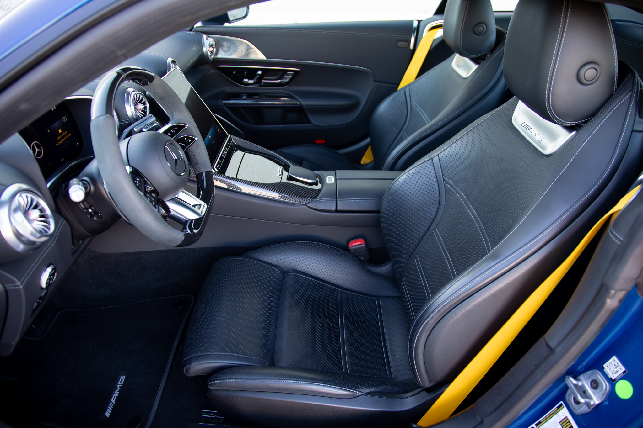 Beneath a Black MANUFAKTUR microfiber headliner, carbon fiber trim flows throughout the cabin. Yellow seat belts and an AMG Performance steering wheel reinforce driver-focused design with motorsport inspiration. Tech amenities further include include the High-End Burmester® 3D Surround Sound System, MAGIC VISION CONTROL, and Driver Assistance Package extras. Showing an odometer reading of just 6k miles, this Affalterbach star is offered at a sweet-spot of like-new luxury and performance.