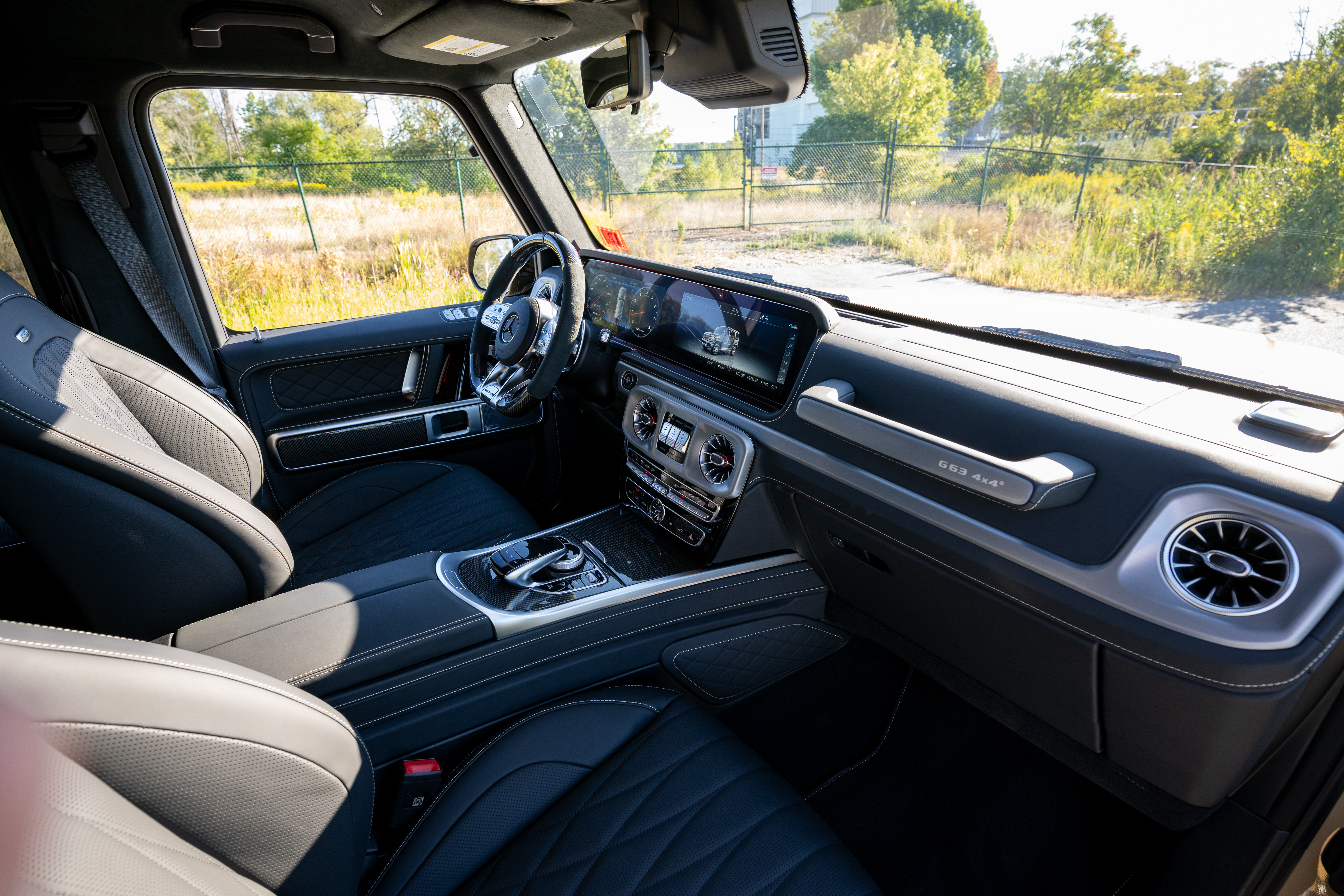 The top-end 4x4 “Squared” edition of the G63 makes its presence known immediately with modified suspension and a host of options designed for extreme off-road performance. Ground clearance towers at 13.8 inches, the approach angle is 41.3 degrees, and massive all-terrain tires sit on 22” wheels. A wide body kit with carbon fiber fender flares and a roof rack ($5,000) with integrated LED light bar (disconnected in the U.S. market) are cosmetic touches that help it stand out.