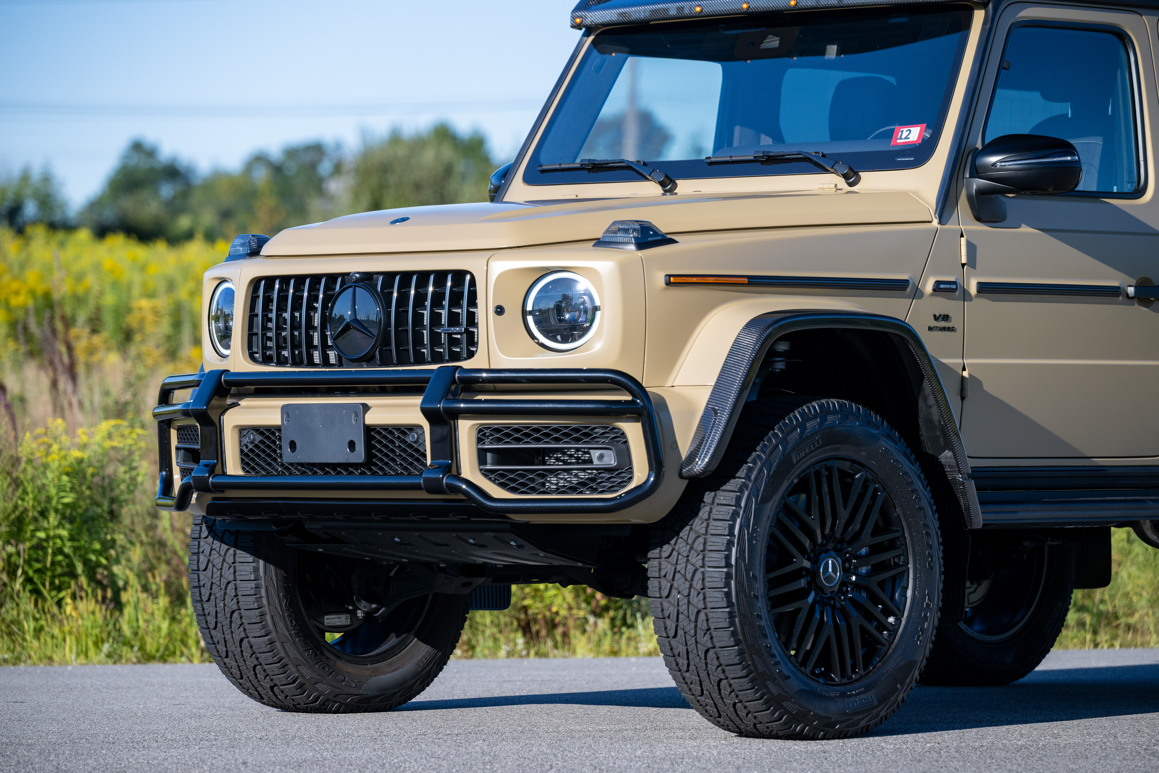 This 2024 Mercedes-Benz AMG G63 is a rare 4x4 Squared edition, finished in Desert Sand ($6,500) under a matte paint protection film with a Black Leather interior, contrast stitching in Gold, and AMG carbon fiber trim. Its imposing size comes from far more than a simple lift kit; it reflects the highest standard in performance and capability. The handcrafted 4.0L V8 includes two turbochargers for 577 horsepower and 627 lb-ft of torque. Off-road, the 9-speed SPEEDSHIFT transmission includes low-range modes and the confidence of sequentially lockable differentials. On pavement, its performance exhaust and braking systems further push the limits. Yet, it’s still a Mercedes-Benz, with everything from a power sunroof to a Burmester Surround Sound System equipped. Currently located in Portsmouth, New Hampshire, this G63 comes with only 28 miles.