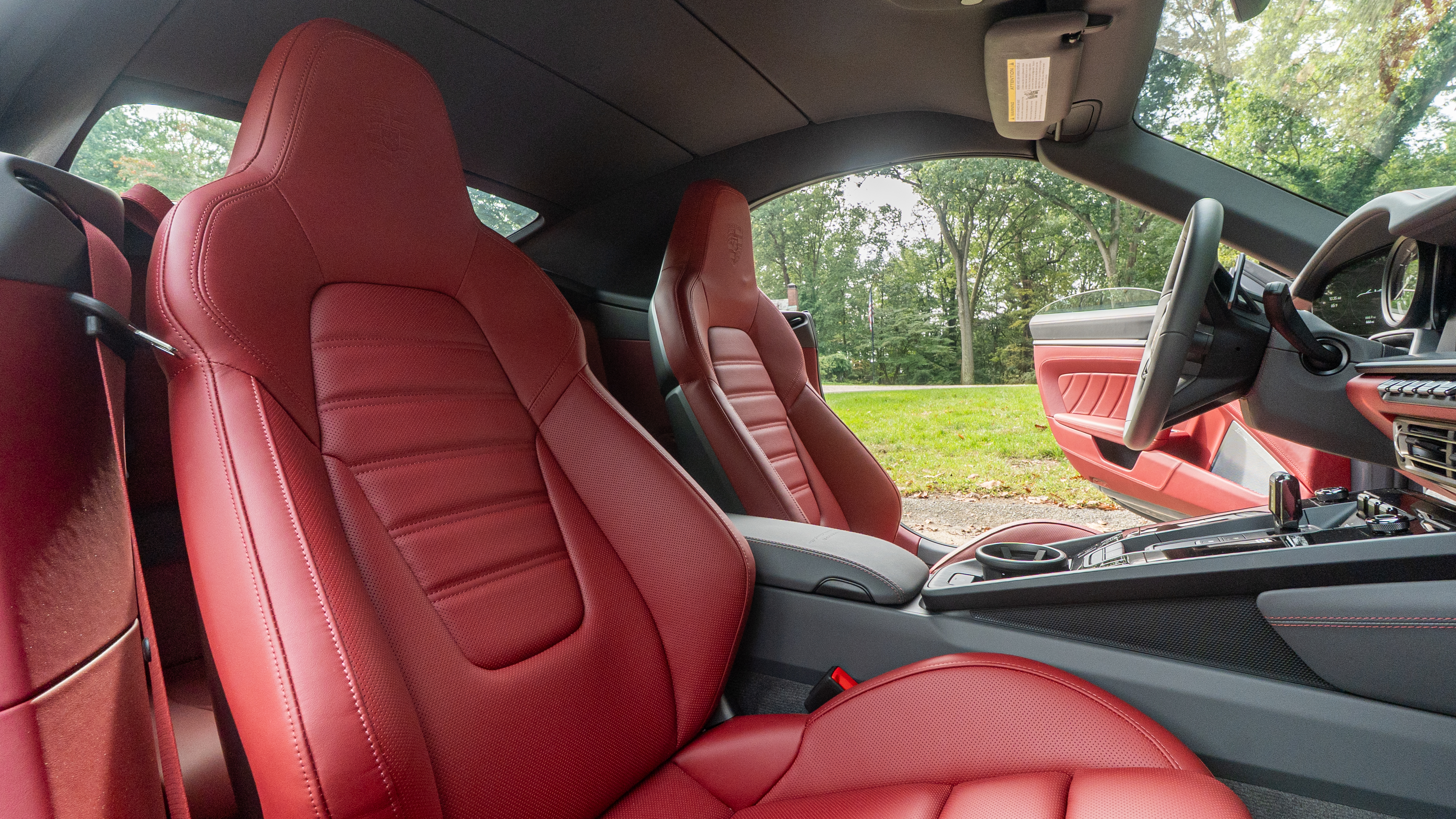 The cabin showcases Porsche’s Exclusive Manufaktur Leather Interior in Slate Grey and Bordeaux Red, with custom details such as seat belts in Bordeaux Red, leather-finished rear speaker trim, and passenger cupholder. The Adaptive Sport Seats Plus (18-way) with memory, ventilated seats, and heated GT Sport steering wheel in matte carbon fiber ensure both luxury and functionality. A Porsche Design Subsecond Clock sits elegantly within the dash, reinforcing the model’s focus on precision and craftsmanship.
