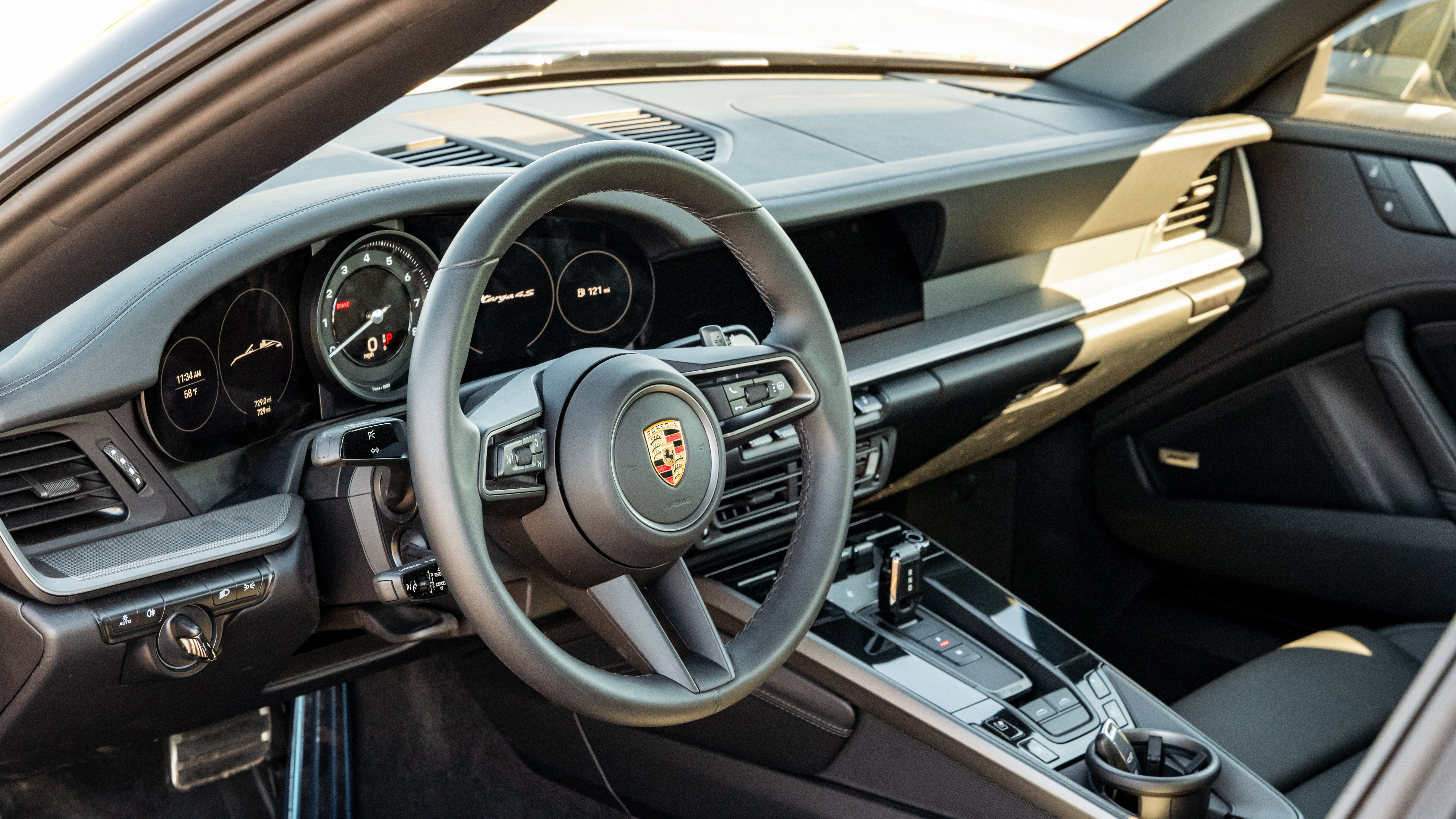 Inside, the cabin showcases the 14-Way Power Sport Seats with Memory Package trimmed in full leather, complemented by the Premium Package, which adds ventilated seats, BOSE Surround Sound System, ambient lighting, Porsche Dynamic Light System Plus (PDLS+), and Lane Change Assist. Modern convenience is enhanced by Adaptive Cruise Control, Surround View, and Power Steering Plus. The driver-centric cockpit pairs tactile analog controls with digital instrumentation, creating a perfect harmony of tradition and technology.