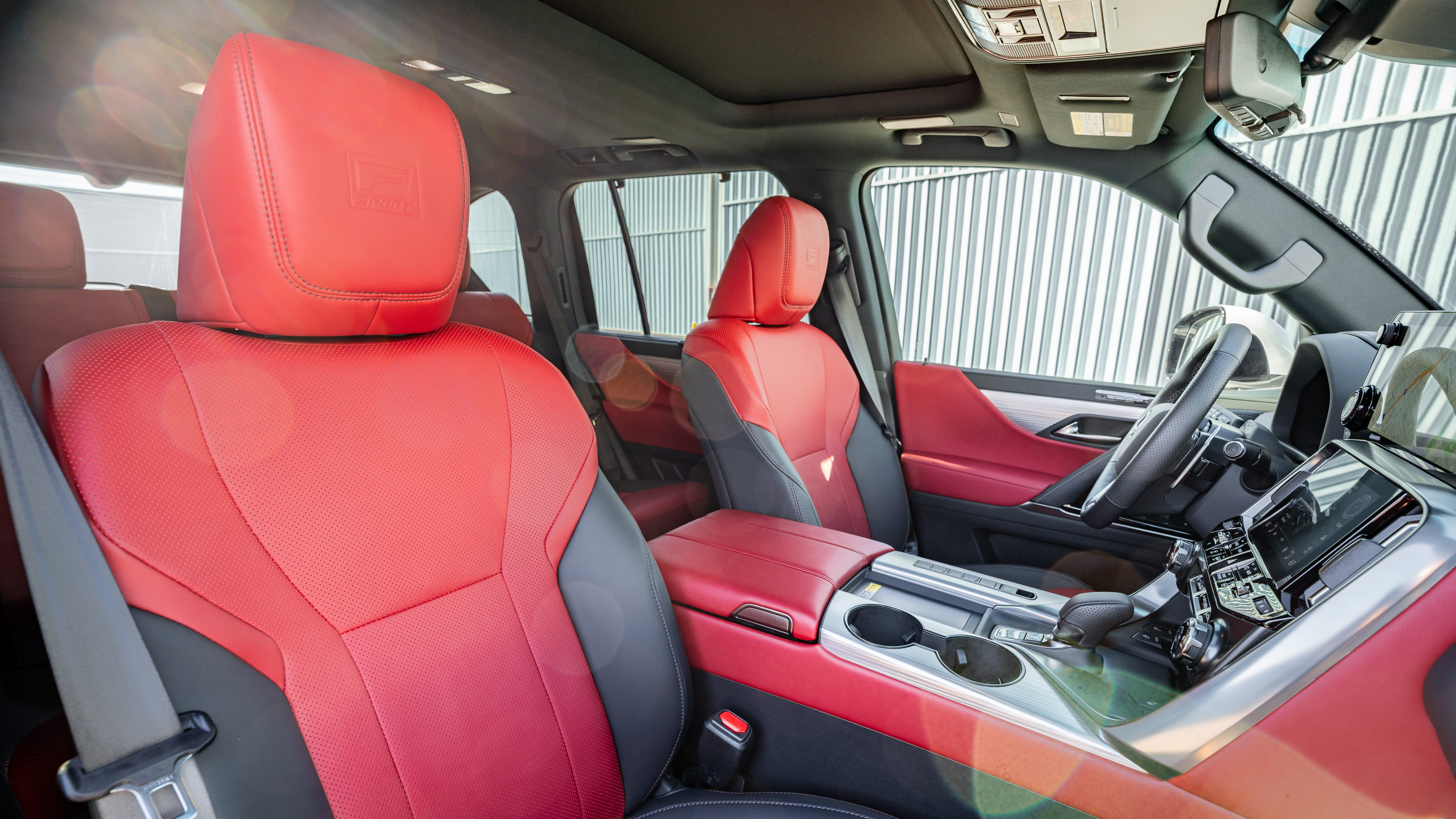 The exterior features signature Triple-Beam LED headlamps, 22-inch F SPORT forged alloy wheels, an F SPORT aerodynamic package, a power moonroof, and a kick-sensor power rear door. Inside, the LX offers a cabin tailored for luxury and long-distance comfort, equipped with semi-aniline leather-trimmed F SPORT seats with heating, ventilation, driver memory, and massage functionality. Additional amenities include a Mark Levinson® premium audio system, 4-zone Climate Concierge, thematic ambient lighting, a cool box, manual rear sunshades, and both heated and ventilated second-row seats. Technology features are comprehensive, with the 12.3-inch Lexus Interface touchscreen, wireless Apple CarPlay and Android Auto, head-up display, digital rearview mirror, and an array of connected services.