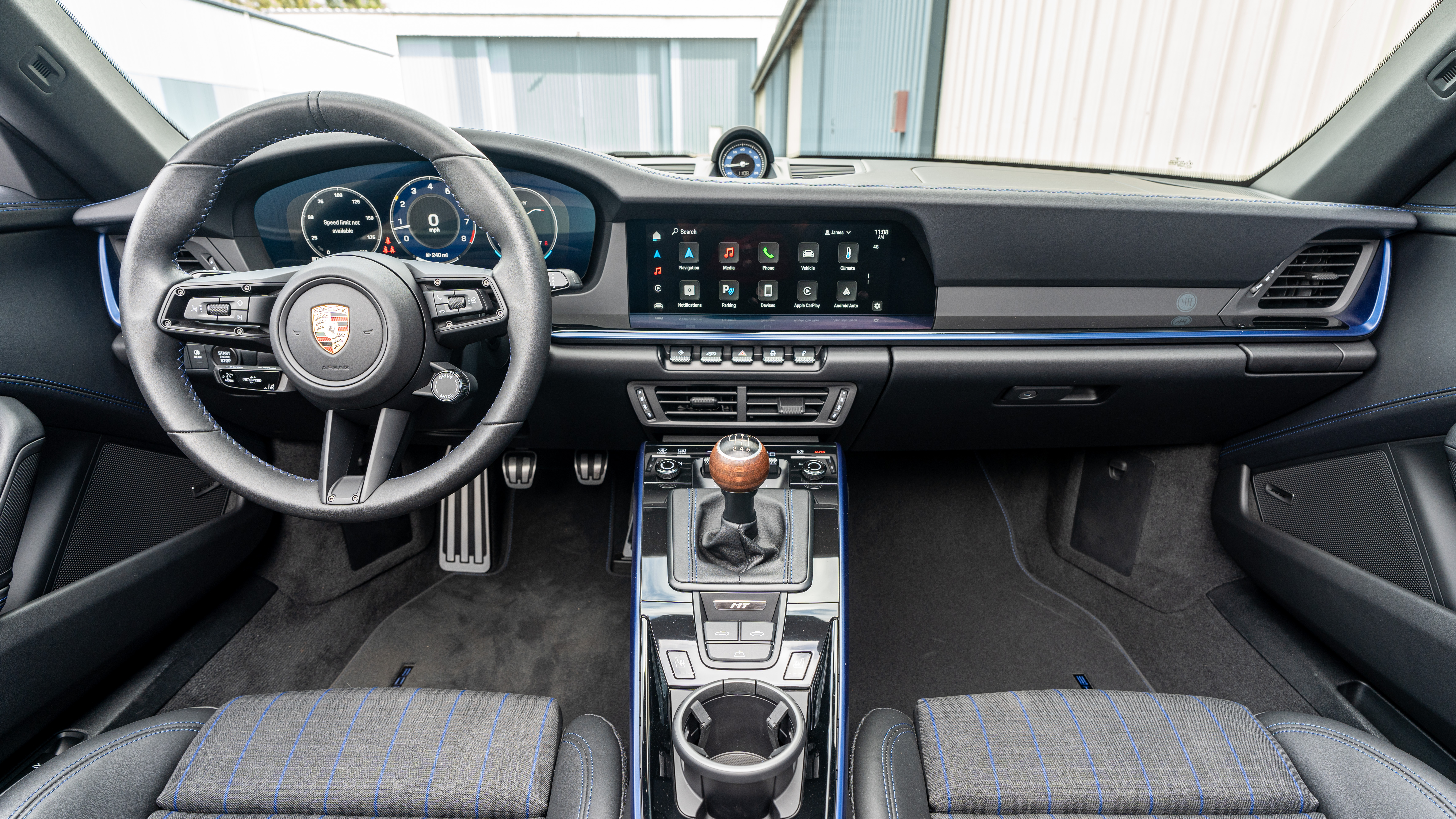 The build reflects a tasteful blend of performance and refinement. Key factory options include the Carrera T Interior and Exterior Packages in Gentian Blue, SportDesign Package, Sport Tailpipes in Titanium, and Adaptive Sport Seats Plus (18-way) with Memory Package. Technology and comfort are further enhanced by the BOSE® Surround Sound System, Surround View, Lane Change Assist, and Power Steering Plus. The extended range 22.1-gallon fuel tank and black Cabriolet roof complete the specification, adding both practicality and aesthetic balance.
