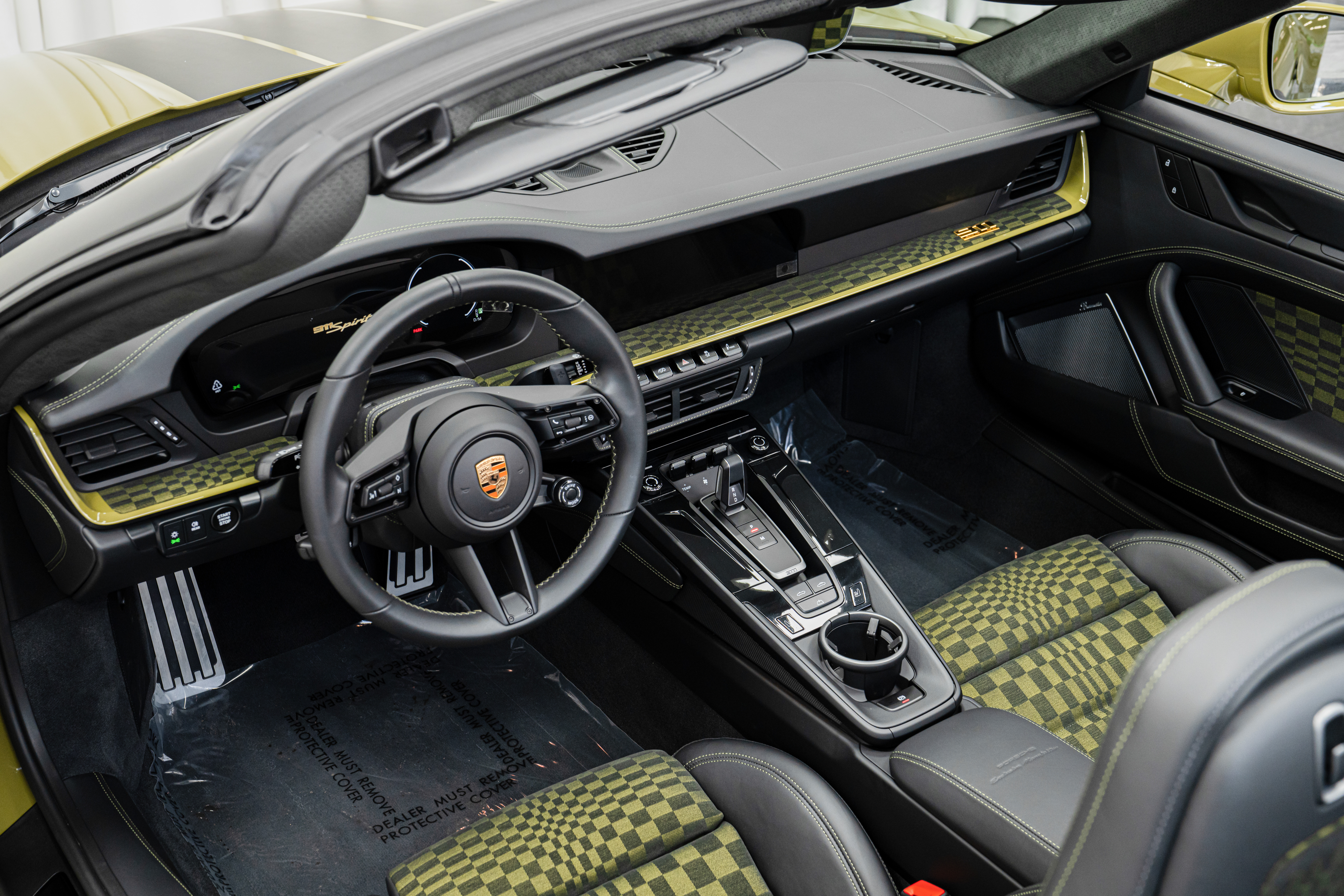 Inside, the cabin is equally evocative, featuring the full Spirit 70 interior treatment. Club leather in Basalt Black is paired with black and Olive Neo Pascha cloth seat inserts, complemented by Pascha trim on the dashboard and door panels, Olive Neo painted dash accents, and a gold-plated edition badge. Additional heritage touches include the historically inspired gauge cluster and Sport Chrono face, Heritage Design floor mats with leather edging, a 1963-era Porsche crest on the steering wheel and headrests, illuminated sill plates, and bespoke welcome lighting. Comfort and technology are fully modern, with heated 18-way adaptive sport seats, a Burmester High-End Surround Sound System, and extensive Porsche Exclusive Manufaktur detailing throughout.