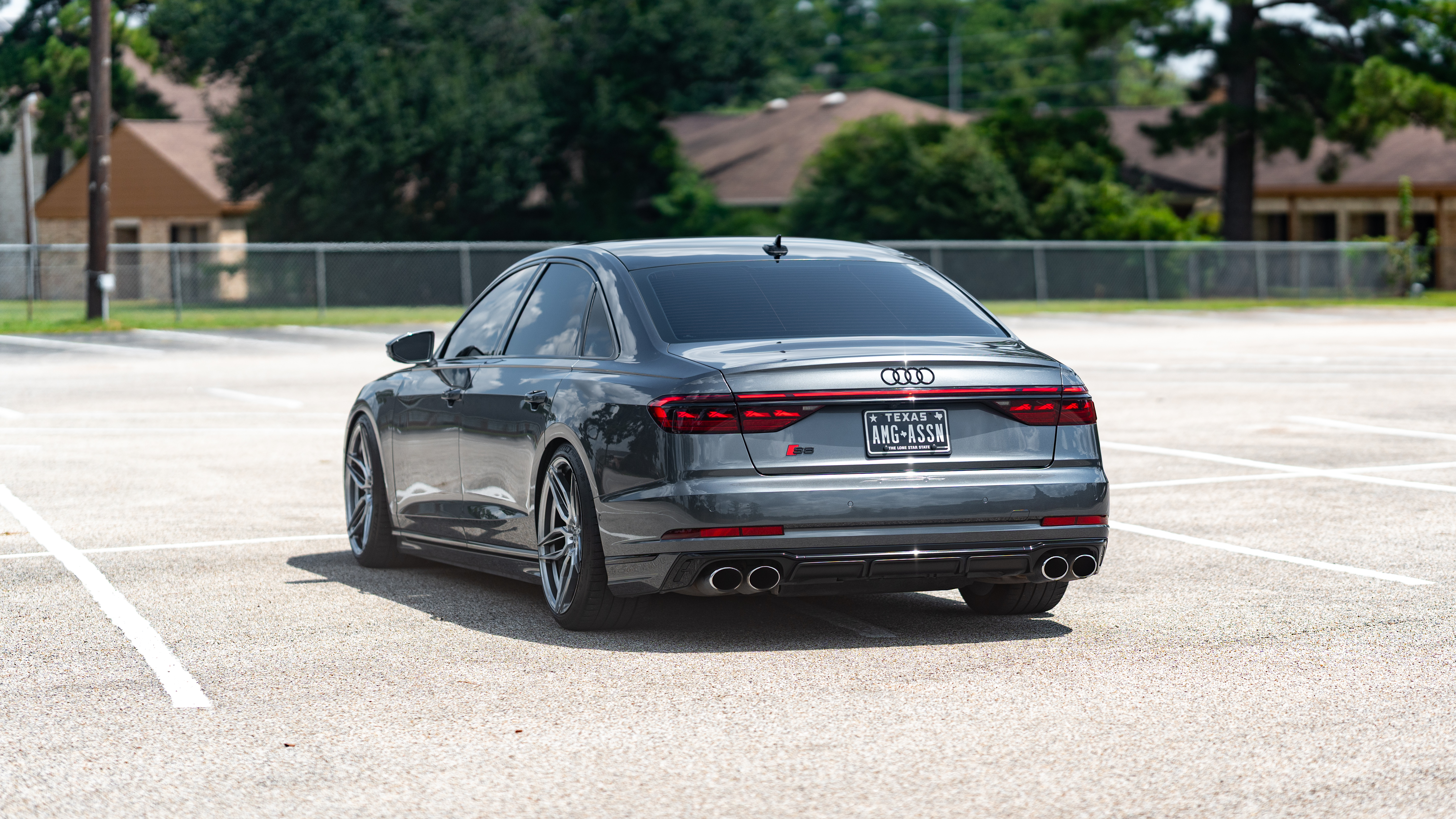 Sitting on ADV.1 Monoblock platinum-finished wheels wrapped in Michelin Pilot Sport 4S tires, this S8’s appearance signals massive performance under the hood. Professionally installed Stage 2 ECU & TCU tunes pair with a free-flowing titanium downpipe to net a projected engine output over 700 horsepower reported by the seller. The formidable 4.0L twin-turbo V8 is matched by Quattro all-wheel-drive grip, dynamic rear-steer chassis innovations, and a modified Active Suspension Control module with 4” adjustable ride height. Sold with a clean title, Carfax history, and Seller’s Disclosure, this 26k-mile flagship sedan makes an entrance.