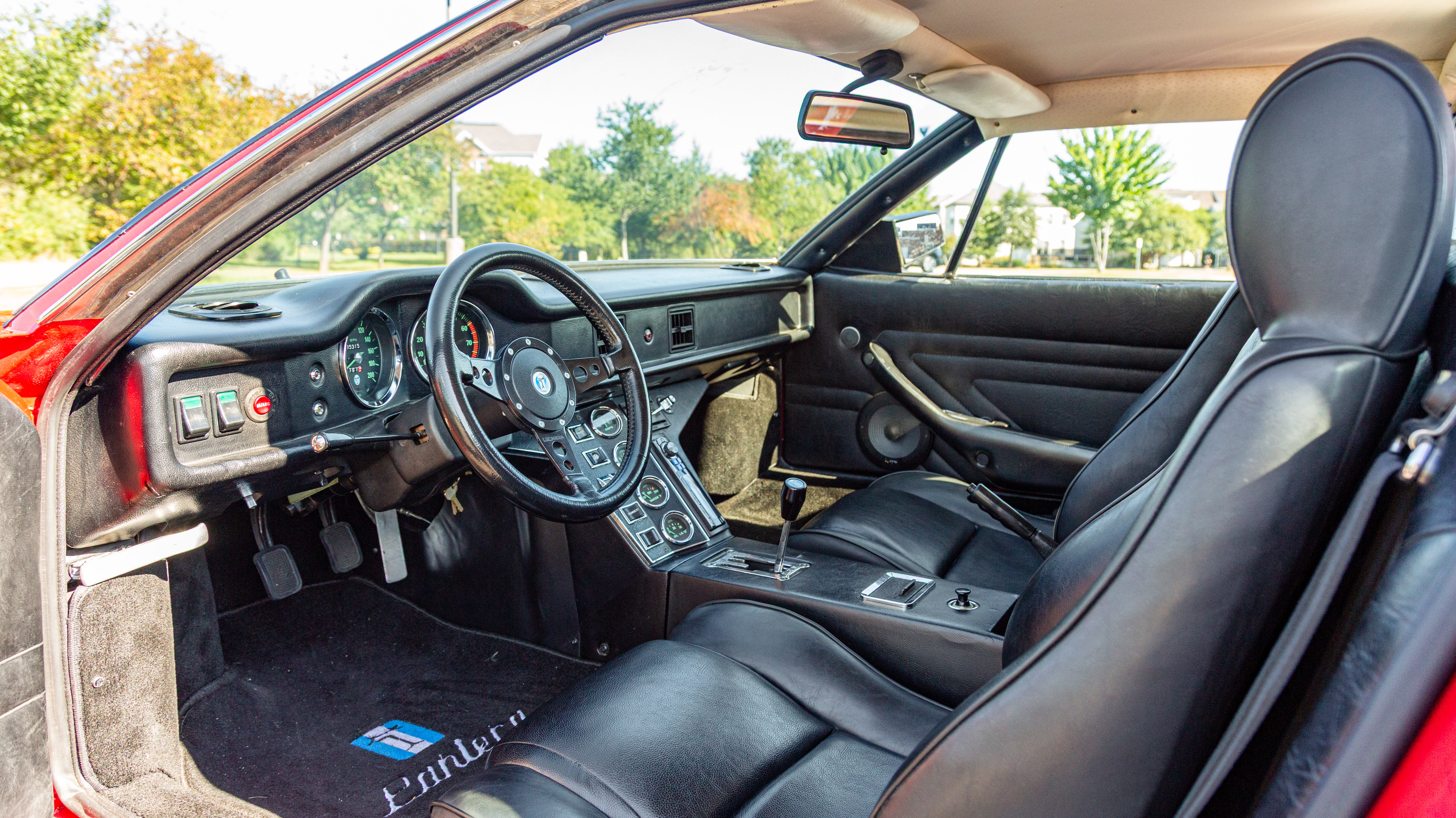 Inside, the black interior showcases a driver-focused layout with leather-trimmed bucket seats, Veglia Borletti instrumentation, and a gated shifter commanding the mid-mounted powertrain. Standard features included air conditioning, power windows, and disc brakes at all four corners, reflecting the Pantera’s balance of performance and comfort. The cabin’s combination of analog instrumentation, sculpted dash, and purposeful ergonomics speaks to the Pantera’s dual identity as both an exotic sports car and a road-capable grand tourer. This example offers enthusiasts a classic blend of Italian design and American muscle, ready to be appreciated by its next custodian.