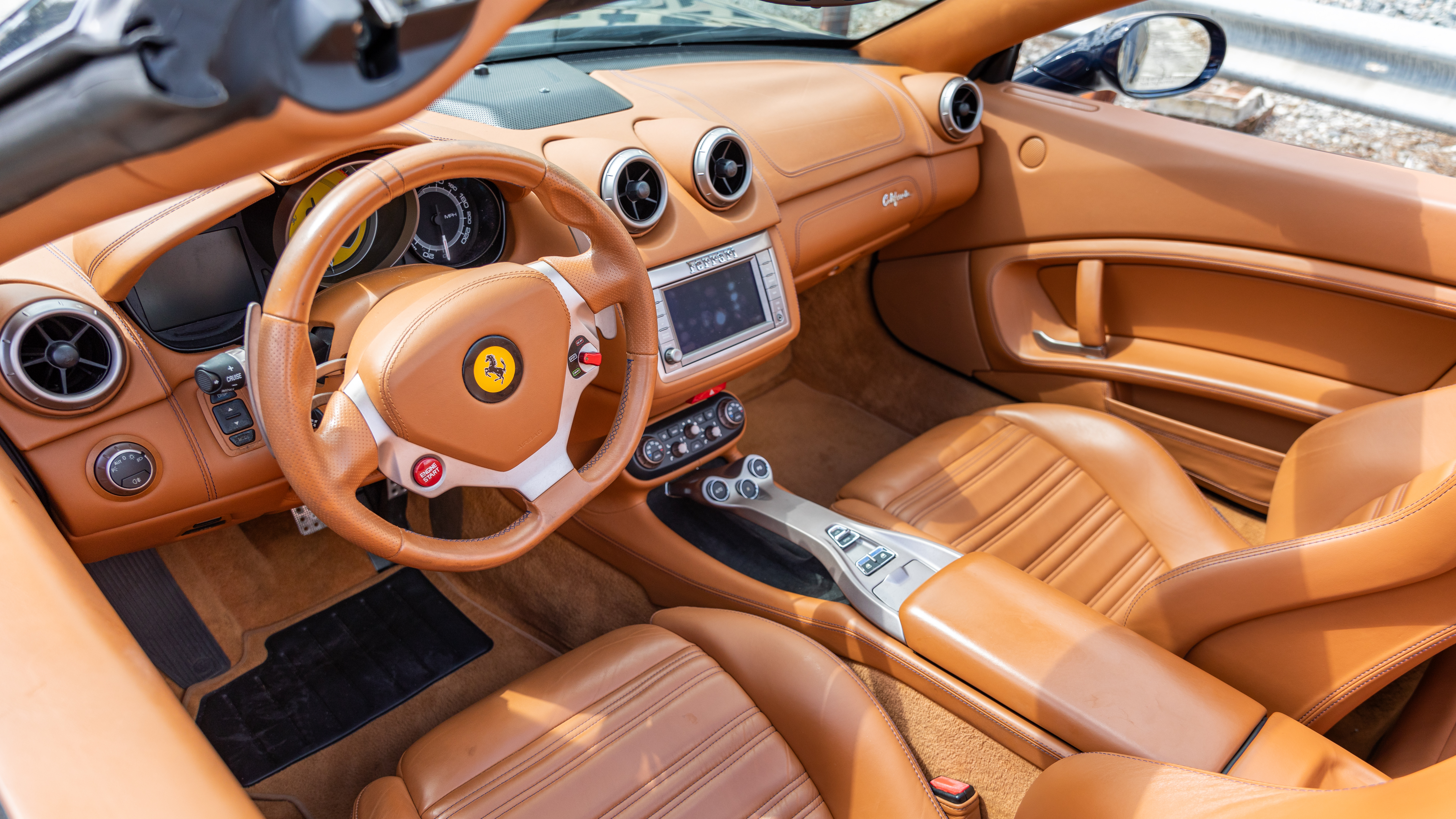 Inside, the California offers a refined blend of luxury and performance-focused design. The leather-appointed cabin features aluminum accents, a leather-wrapped steering wheel with integrated controls, and dual-zone automatic climate control. The infotainment system includes navigation, Bluetooth connectivity, voice command, and audio controls mounted behind the steering wheel spokes. Seating is designed for both comfort and engagement, with power-adjustable leather bucket seats complemented by Ferrari’s signature craftsmanship and attention to detail.