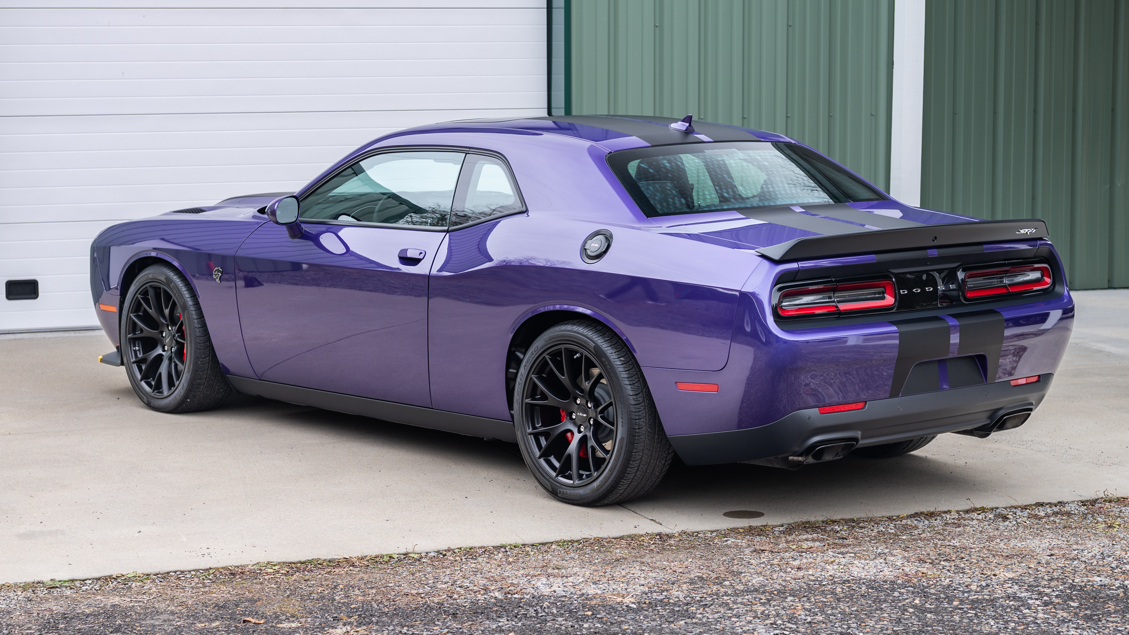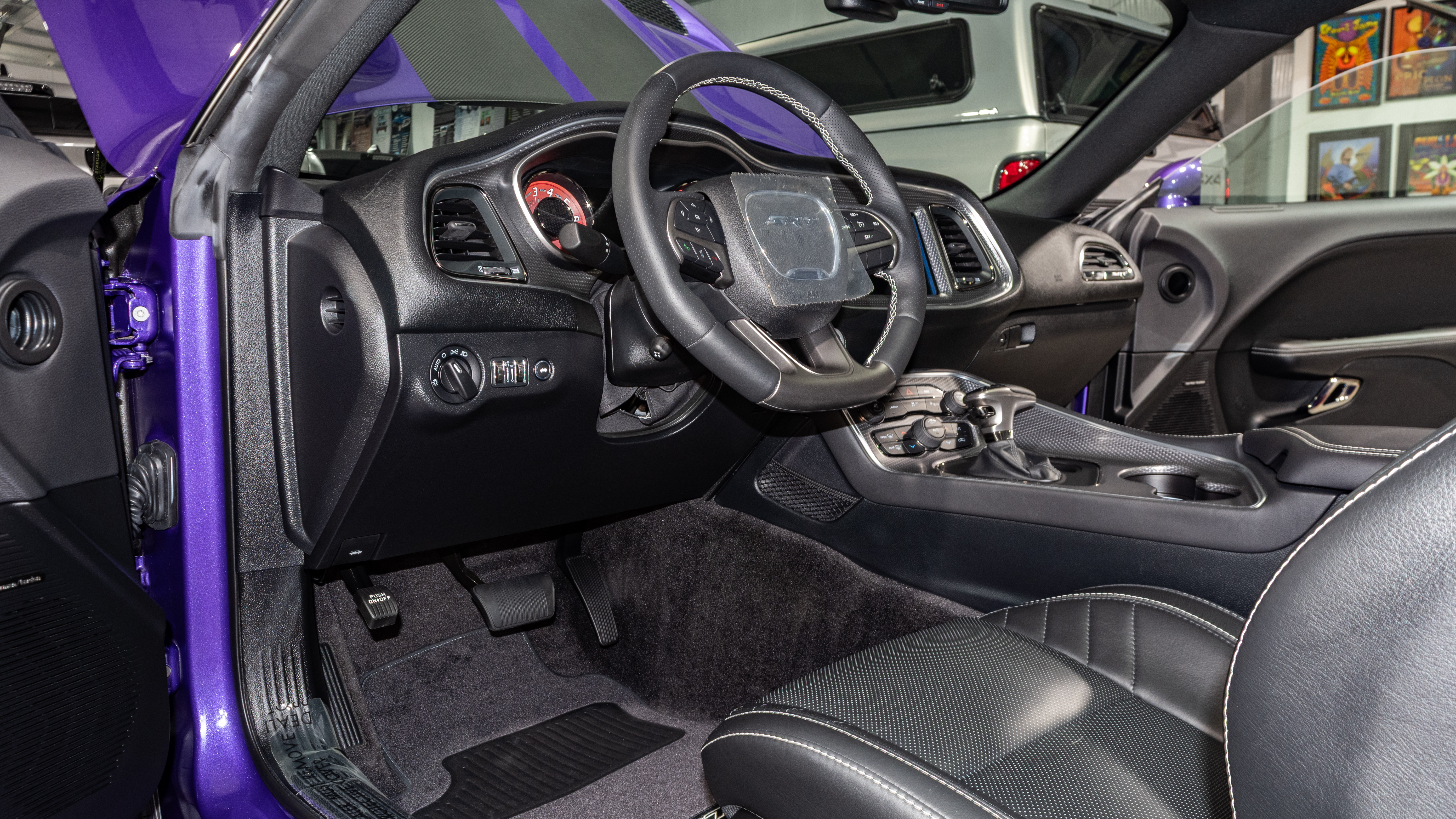 Presented in rare and desirable Plum Crazy Pearlcoat, this 2016 Dodge Challenger SRT Hellcat represents one of the most iconic modern American muscle cars, made all the more compelling by its extraordinarily low 288 miles from new. Powered by the legendary supercharged 6.2-liter HEMI V8—factory-rated at 707 horsepower—and paired here with the optional 8-speed HP90 automatic transmission, this Hellcat delivers immense performance with refined drivability. The original MSRP totaled $69,670, reflecting a carefully curated spec that balances performance, presence, and comfort.