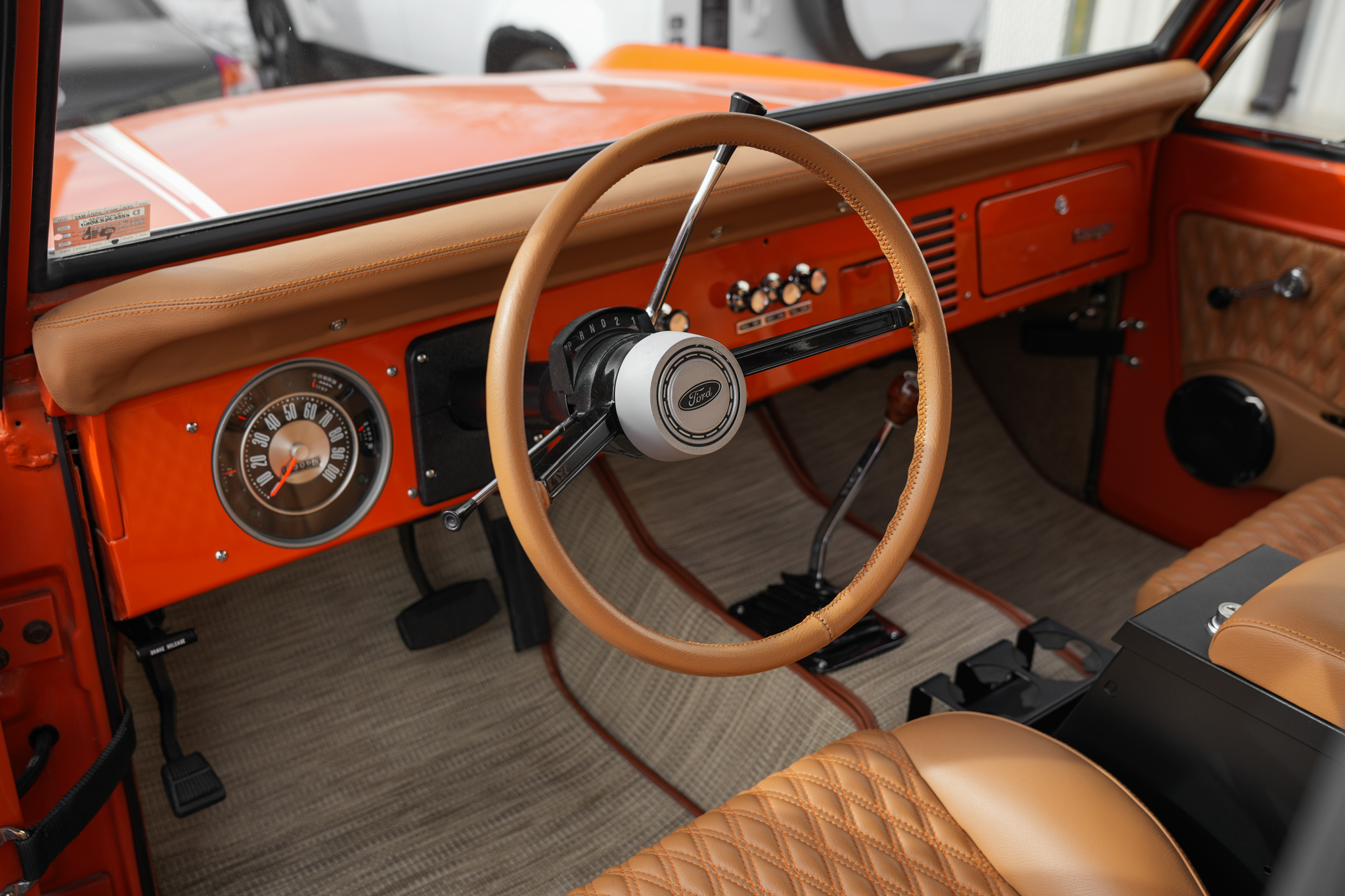The cabin has been fully retrimmed with a custom tan leather interior featuring diamond-stitched inserts and orange contrast stitching, plus woven waterproof vinyl floor coverings for durability. A James Duff shifter and functional components including a new heater box, window regulators, and more bring crisp fit and finish throughout. Additional upgrades of a Tuffy locking center console, leather-wrapped steering wheel, new instrument cluster with auxiliary gauges, and a Krawler’s Edge–style roll bar, create a cockpit that balancing rugged utility with bespoke soul.